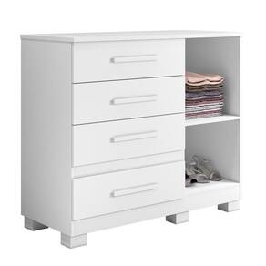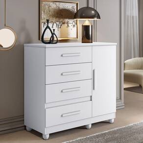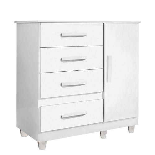 Cômoda New Florença Benetil Branco Quer um móvel para deixar seu quarto mais prático e funcional? A Cômoda Florença é perfeita para você. Possui quatro gavetas com excelente profundidade e espaço interno. As gavetas com corrediça telescópica proporcionam maior abertura e melhor aproveitamento do espaço. É fabricada com materiais de alta qualidade, oferecendo mais firmeza e durabilidade. Além disso, tem uma porta que auxilia na organização e armazenamento dos objetos. Os puxadores são madeirados, proporcionando um ótimo acabamento ao móvel. Características: Marca: Benetil Estilo: Moderno Origem do produto: Nacional Material principal: MDP Ambiente principal: Quarto Escala de Brilho: Fosco Possui gavetas: Sim, 4. Tipo de Corrediça: Telescópica Tipo de Puxador: Madeirado Possui portas: Sim, 1. Possui pés: Sim, 4. Altura dos pés: 5 cm Material dos pés: PVC Necessita montagem: Sim