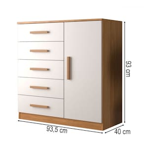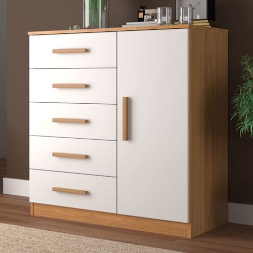 O(a) Cômoda New Monaco 1 Porta 5 Gavetas Cinamomo/Branco - Evidencia Móveis é produzido em MDP na escala de brilho Semi-Brilho, e possui um grau de dificuldade de montagem: Médio.