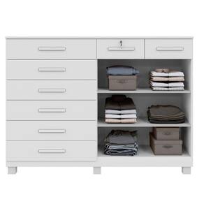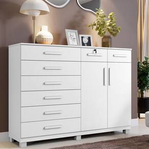Cômoda New Triunfo 8 Gavetas 2 Portas 2 Prateleiras Branco A Comoda New Triunfo e a escolha perfeita para completar seu quarto com charme e elegancia, oferecendo uma ampla capacidade de organizacao e um toque sofisticado. Com oito gavetas espacosas, incluindo uma com chave para seguranca, suas corredicas telescopicas garantem suavidade e resistencia no uso diario, tornando-a pratica e segura. Alem disso, conta com duas portas e duas prateleiras internas que formam uma sapateira bem definida, otimizando o espaco de forma eficiente. O tampo robusto de 15 mm assegura durabilidade e resistencia. Produzida com a linha MDP Perfect, essa comoda combina sustentabilidade e inovacao tecnologica, garantindo facil manutencao e longa vida util. A pintura UV de alta resistencia e facil de limpar e ecologicamente correta, utilizando madeira de reflorestamento, contribuindo para a preservacao ambiental. Caracteristicas: Material Principal Mdp Espessura Da Chapa: 15 Mm Escala De Brilho: Semi Brilho Acabamento: Pintura UV Sistema De Montagem: Parafuso, Cavilha E Cantoneiras Metalicas
