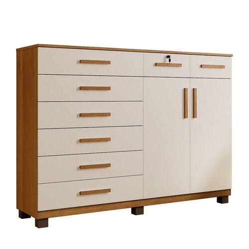 Cômoda New Triunfo 8 Gavetas 2 Portas Benetil Cinamomo/off White Quer um móvel prático e funcional para o quarto? A Cômoda Triunfo é ideal! As oito gavetas contam com amplo espaço interno, além de ótima profundidade, deixando tudo mais organizado. Além disso, possuem corrediças telescópicas e chave em uma das gavetas. Os puxadores são madeirados, proporcionando um ótimo acabamento ao móvel. A estrutura do tampo em MDP 15mm proporciona mais firmeza e durabilidade. É ideal para deixar o quarto mais prático e bonito! Características: Marca: Benetil Estilo: Moderno Material principal: MDP Escala de Brilho: Fosco Necessita montagem: Sim Gavetas: Sim, 8. Chaves: Sim Corrediça: Telescópica Puxador: Madeirado Portas: 2 Prateleira: Sim, interna. Necessita Montagem: Sim