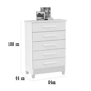 Cômoda com 5 Gavetas Paola A Cômoda Paola com 5 Gavetas Rud Rack é uma excelente opção para quem busca praticidade, organização e um toque moderno na decoração do quarto. Com design funcional e linhas discretas, ela se adapta facilmente a diferentes estilos de ambiente, oferecendo uma solução eficiente para manter roupas e objetos pessoais sempre bem organizados. O modelo conta com cinco gavetas espaçosas, ideais para acomodar desde peças do dia a dia até itens menores, como acessórios e documentos. As corrediças proporcionam um deslizamento suave e seguro, facilitando o uso constante. O tampo superior também pode ser utilizado para apoiar itens decorativos, como porta-retratos, luminárias ou perfumes. Fabricada com materiais de qualidade e acabamento resistente, essa cômoda combina durabilidade e elegância em um só produto. Compacta e funcional, ela é perfeita para otimizar o espaço e contribuir para um ambiente mais prático, organizado e visualmente agradável.\nMEDIDAS\nAltura 100 cm\nLargura 64 cm\nProfundidade 44 cm\nCARACTERÍSTICAS\nFabricante Rud Rack\nModelo Cômoda Paola\nGarantia 3 meses\nTipo de produto Cômoda\nAmbiente Quarto\nEstrutura MDP/MDF\nQuantidade de Gavetas 05\nTipo de Corrediça Metálica\nMaterial Puxadores PVC\nMaterial Pés PVC\nQuantidade de Pés 04\nNecessita Montagem Sim\nAcompanha Manual de Instalação Sim\nINFORMAÇÕES IMPORTANTES\nObjetos decorativos que porventura apareçam na foto, não acompanham o produto. Não nos responsabilizamos pela montagem/instalação dos produtos.\nMontagens, desmontagens e instalações são responsabilidades do cliente. Indicamos que contrate uma empresa de montagem ou um montador de sua confiança.\nAlém disso, favor verificar se os pés e acessórios estão dentro do forro inferior do produto. Em suma, todas as informações divulgadas sobre o produto são de responsabilidade do Fabricante.\nAs cores do produto podem variar de acordo com o seu monitor, a iluminação do ambiente em que você está e até mesmo a sua percepção visual. Além da cor, pequenos detalhes e acabamentos podem não ficar evidentes na foto, por isso as imagens são meramente ilustrativas