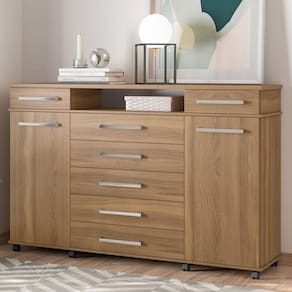 Estar de casa nova é uma delícia, a parte de mobiliar é tão difícil ainda mais se tratando daquele lugarzinho de descanso que mais amamos, mas tem dúvida em qual móvel comprar? Temos uma dica importantíssima!A Cômoda London é um dos móveis mais completo que você pode imaginar para compor seu quarto, o que chama atenção é as repartições que foram bem elaboradas e distribuídas de um jeito funcional. A cômoda vem com 7 gavetas, 2 portas uma com cabideiro e a outra acompanha 2 prateleiras para que suas roupas e pertences ficam mais organizados e acomodados facilitando na hora de se arrumar e um pequeno nicho onde objetos podem ser colocados como decoração, o grande destaque é seu tampo que suporta uma televisão de 50 polegadas.Perfeita para o seu quarto né! Corra e não fique de fora dessa!Dimensões do Produto:Largura: 170 cm.Altura: 112 cm.Profundidade: 45 cm.Peso: 81,90 kg.Características dos Produtos:Material da Estrutura: MDP.Peso Suportado: 5kg por prateleira, 3 kg por gaveta, 10kg base, 8kg tampo.Acabamento: Pintura UV.Escala de Brilho: Fosco.Possui Pés: Não.Possui Rodízios: Sim.Possui Gavetas: Sim.Quantidade de Gavetas: 7 Gavetas.Tipo de Corrediças: Telescópicas.Possui Portas: Sim.Quantidade de Portas: 2 Portas.Tipo de Porta: Convencional.Possui Prateleiras: Sim.Quantidade de Prateleiras: 2 Prateleiras.Possui Cabideiro: Sim.Possui Nichos: Sim.Quantidade de Nichos: 1 Nicho.Diferenciais:- Design Moderno;- Amplo espaço interno;Sistema de montagem: Parafusos/Pregos/Cavilhas.Manual de montagem: Sim.Complexidade da Montagem: Média.Conteúdo da Embalagem: 1 Cômoda.Volumes: 2 Volumes.Garantia do fabricante: 90 dias contra defeito de fabricação.Montagem: Aconselhamos que seja feita por um profissional.Recomendação de limpeza: Utilize pano levemente úmido.Observações importantes:- Produto para uso residencial em ambiente interno, não devendo ficar exposto diretamente ao sol, calor e umidades excessivas.- Pode haver alguma diferença de tonalidade entre a imagem e o produto real, por conta do tratamento de imagens e a calibração de cores do seu monitor.- As imagens são meramente ilustrativas, não acompanham objetos de decoração e eletrônicos.- Confira o estado da embalagem, não devendo assinar o comprovante em caso de danos.- Não asseguramos, no ato da entrega, por subir escadas/elevadores, pelo transporte por guincho em apartamentos ou montagem, desmontagem e instalações. Eventuais despesas são por conta do comprador.- Confira as dimensões do produto e certifique-se de que passará normalmente por supostos elevadores, portas, escadas e/ou corredores de sua residência.