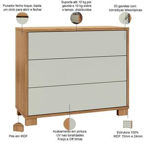Com corrediças: Sim | Com rodas: Não | Material das dobradiças: na | ProductHeight: 87 cm | OriginCountry: Brasil | Com alça: Não | Cor: Freijó Off White | Altura: 87 cm | Color: Freijó | ColorFamily: Freijó | ColorSimple: Freijó | ColorSupplier: Freijó Off White | Largura: 105 cm | Material: MDF | MaterialFamily: MDF | Model: Click | OriginState: PR | SizeDescription: Altura: 87 cm x Largura: 105 cm x Profundidade: 44 cm | Requer montagem: Sim | Profundidade: 44 cm | É personalizado: Não | ProductWarranty: 90 dias após o recebimento do produto | ProductWidth: 105 cm | Com prateleiras: Não | Linha: Quarto | Material do cabo: na | ProductContents: 01 Cômoda | Quantidade de gavetas: 3 | ProductInstructions: Produto para uso em ambiente interno, nao devendo ficar exposto ao sol, calor e umidade excessivos. | ProductWeight: 52 kg | Com bandeja removível: Não | ProductLength: 44 cm | SupplierSimpleName: Cômoda Para Quarto 3 Gavetas 105cm Click D03 Freijó Off White - Lyam Decor | Material das corrediças: Telescópicas Metálicas | Peso: 52 kg | Inclui ferramentas de montagem: Não