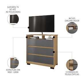Com design compacto, para aproveitar cada cantinho, essa cômoda moderna pode ser aproveitada tanto no quarto adulto, quanto no quarto infantil, já que as cores harmonizam facilmente com diversos estilos de decoração. Além disso, o charme fica por conta dos dois nichos abaixo do tampo, nos quais você poderá adicionar um toque de personalidade com objetos decorativos que expressem o seu gosto. Para completar a funcionalidade, o tampo suporta receber televisores de até 42 polegadas, ou seja, mais otimização de espaço, com o máximo de conforto e bem-estar.