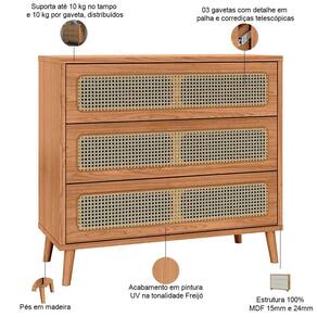 Cômoda Para Quarto 3 Gavetas Com Palha 105cm Pés Retrô Arnoni D03 Freijó - Lyam Decor