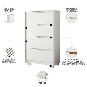 Suas gavetas espaçosas, com puxadores cava, oferecem amplo espaço de armazenamento para seus pertences pessoais, mantendo tudo organizado e sempre ao alcance das mãos. As corrediças telescópicas proporcionam um deslizamento suave e silencioso, garantindo um uso fácil e confortável no dia a dia. Outro grande diferencial desta Cômoda é a possibilidade de personalizar a cor das vistas, graças ao sistema de montagem flex. Essa flexibilidade permite que você adapte o móvel ao seu estilo e à decoração do ambiente, seja no quarto de casal ou no quarto de solteiro. Seu design moderno e clean se encaixa perfeitamente em qualquer espaço, trazendo sofisticação e charme para o seu lar. Combinando durabilidade, funcionalidade e beleza, a Cômoda 4 Gavetas é a adição que falta para transformar o seu quarto. Não perca a chance de adquirir um móvel de excelente qualidade, que oferece praticidade e estilo, com um acabamento impecável, em uma peça que vai durar por muitos anos.
