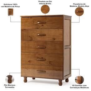 Com 5 gavetas espaçosas oferece uma solução prática para guardar roupas, acessórios e itens pessoais, mantendo tudo ao seu alcance e longe da bagunça. Além disso, é uma cômoda fabricada em madeira maciça e com o acabamento em imbuia brilho, ou seja, sinônimo de beleza duradoura e facilidade na manutenção. Por fim, o design clássico e os pés torneados garantem que essa cômoda de madeira harmonize facilmente com qualquer estilo de decoração, trazendo um toque de sofisticação atemporal ao seu ambiente. Mais que uma cômoda, uma peça essencial para um quarto organizado e elegante. Garanta já a sua!