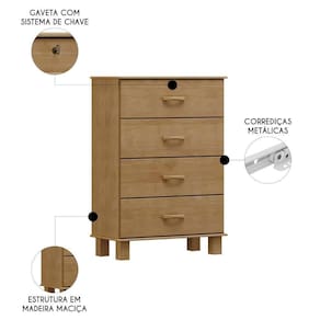 Esta Cômoda Grande conta com quatro gavetas espaçosas, perfeitas para organizar roupas, acessórios e itens pessoais. Uma das gavetas possui chave, garantindo segurança para objetos mais delicados ou importantes.