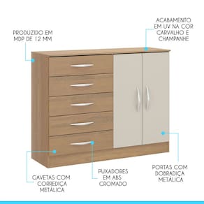 Caracter?sticas: Refer?ncia: 1043 Material: MDP de 12 mm Acabamento: Pintura UV na cor Carvalho Dakar e Champanhe Gavetas: 05 Portas: 02 Gavetas com Corredi?a Met?lica Puxadores em ABS Cromados