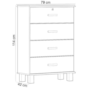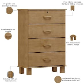 Fabricada em 100% madeira maciça, essa cômoda quatro gavetas agrega espaço generoso para uma organização inteligente de roupas, acessórios ou itens pessoais, tornando-se perfeita para quartos de casal, que merecem mobiliário à altura, closets organizados com um toque de sofisticação ou qualquer outro ambiente onde cada detalhe é cuidadosamente planejado.