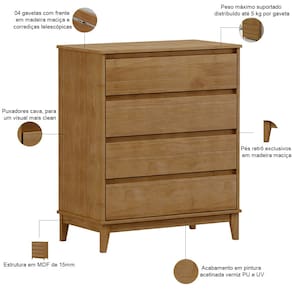 Cada detalhe foi pensado para simplificar sua rotina: desde as 4 gavetas espaçosas com deslize suave para guardar roupas, acessórios ou itens pessoais, passando pela estrutura em MDF resistente e acabamento nobre que garantem durabilidade até os pés em madeira maciça, um contraste perfeito que acrescenta personalidade. Em outras palavras, essa cômoda é ideal para quartos, corredores ou até salas, pois se adapta com naturalidade a qualquer cenário, provando que organização pode ser sinônimo de beleza.