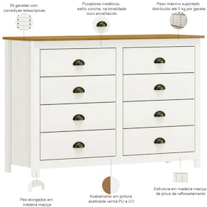 Fabricada em madeira maciça de primeira qualidade, essa cômoda para quarto é um verdadeiro dois-em-um: guarda-roupa secreto e elemento decorativo. Além disso, cada detalhe foi pensado para unir função e estilo - os puxadores em formato de concha adicionam personalidade, enquanto as gavetas de deslize suave acomodam desde roupas íntimas, roupas de cama, mesa e banho até livros preferidos. Por fim, a estrutura robusta e os pés sólidos garantem estabilidade, transformando a organização do dia a dia em uma experiência prazerosa.