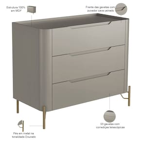 Cômoda Para Quarto Closet Orgânica 3 Gavetas Pés Industrial Dourado Bliss I03 Grigio - Lyam Decor - Bege