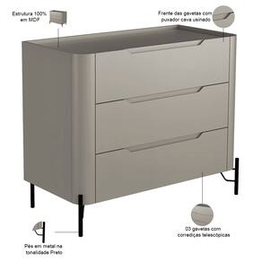 Combinando design orgânico e industrial, essa cômoda moderna traz linhas curvas e pés metálicos, criando um visual único e elegante. Já os puxadores cava garantem um visual clean e contemporâneo, ideal para quartos e closets. Para completar, essa cômoda conta com estrutura robusta, uma vez que é fabricada em 100% MDF, de modo a oferecer durabilidade e resistência, mantendo o charme do seu ambiente por muito mais tempo, enquanto as amplas gavetas dispõem de espaço dinâmico para manter tudo no lugar.