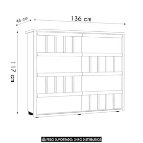 Com 136cm de largura, esta cômoda se adapta perfeitamente a diversos tipos de ambientes seja Quarto de Casal ou solteiro, oferecendo uma solução de armazenamento prática e elegante para o seu lar.