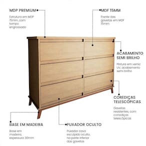A Cômoda Londres é o equilíbrio perfeito entre design moderno, acabamento premium e ótima capacidade de armazenamento. Projetada para atender diferentes estilos de vida e ambientes, ela se adapta facilmente a quartos de casal, solteiro, infantis, de hóspedes ou apartamentos compactos, oferecendo beleza, organização e durabilidade em um único móvel. Criada para transformar o seu ambiente com um design moderno, estrutura robusta e acabamento de alto padrão. Mais do que um móvel, ela é um símbolo de bom gosto, organização e durabilidade.