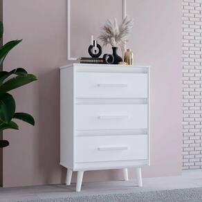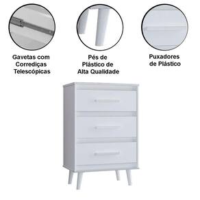 Características da Cômoda com Pés Palito: - Estrutura em mdp; - 3 gavetas com corrediças telescópicas; - Puxadores plástico cromados; - Pé palito; - Altura pé 15,5 cm; - Acabamento em pintura U.V; - Não acompanha objetos de decoração e aparelhos eletrônicos;