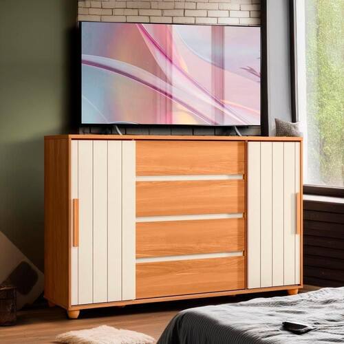 Tampo Amplo e Resistente: Suporta até 65 polegadas, permitindo que a cômoda seja utilizada também como suporte para TV, agregando funcionalidade ao móvel.