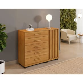 Características: - Produto em 15mm MDP - Cores Disponíveis: Branco com Cinamomo, Cinamomo e Cinamomo com Off White - 1 Porta Ripada - 2 Prateleiras - 5 gavetas - Gavetas com Corrediças Telescópicas - Puxadores em Amadeirados - Pés Incluso - Grande espaço interno - Puxadores: PVC - Acabamento: Pintura UV - Recomendações de manutenção: Limpeza com pano umedecido. Não aplicar lustra móveis.