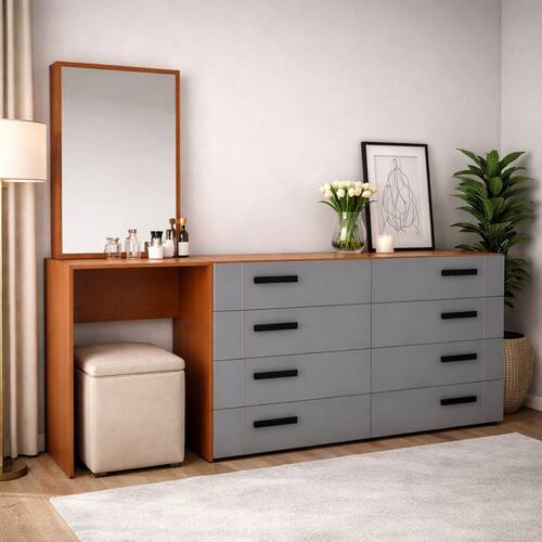 A Cômoda Penteadeira Lisboa 8 Gavetas da Politorno Móveis é a escolha ideal para quem busca máxima organização, elegância e acabamento superior. Com 160 cm de altura, 209,10 cm de largura e 46 cm de profundidade, oferece amplo espaço interno, perfeito para otimizar a rotina com praticidade. Possui puxadores em MDF, que reforçam a robustez e valorizam o design, além de usinagem nas gavetas, um detalhe exclusivo que confere charme e sofisticação ao móvel. O espelho incluso amplia visualmente o ambiente e traz funcionalidade ao dia a dia. As corrediças telescópicas garantem abertura total, suave e silenciosa das gavetas. O acabamento em pintura UV assegura excelente acabamento, durabilidade e fácil limpeza, mantendo o móvel sempre bonito. Acabamento da Gaveta: Pintura UV Acompanha Banqueta: Não Altura do Espelho: 70,8 cm Ambiente Principal: Quarto codigo_ean: 7900288323224 Complexidade da Montagem: Média: pode ser montado por mais de uma pessoa e/ou necessite de maior conhecimento para montagem Cor: Cinza/Freijó Cor do Produto: Cinza/Freijó Escala de Brilho: Semi-Fosco Escala de Brilho da Gaveta: Semi-Fosco Espessura do Espelho: 3 mm Formato do Espelho: Retangular Gaveta com Chave: Não Itens Inclusos: 1 Cômoda, Kit de Ferragens, Manual de Montagem e Termo de Garantia Largura do Espelho: 52,8 cm Linha ou Coleção: Lisboa Manual de Montagem e Instalação: https://product-hub-prd.madeiramadeira.com.br/616458632/documents/b7381314-e762-411b-8fcd-41a6fc90cdfd3377350622417702255652379.pdf Marca: Politorno Material da Gaveta: MDP Material do Puxador da Gaveta: MDF Material Principal: MDP Necessita Montagem: Sim Origem do Produto: Nacional Peso: 58 kg Peso Máximo por Gaveta: 5 kg Possui iluminação: Não Possui Pés: Não Possui Porta Objetos: Não Possui Portas: Não Possui Prateleiras: Não Quantidade de Espelho: 01 Recomendações de Uso, Manutenção e Limpeza: Utilize um pano macio umedecido com água e sabão neutro, seguido de pano seco. Não utilize produtos químicos ou abrasivos para limpeza, pois estes danificam o revestimento do móvel. Sapatas Niveladoras: Não Sistema de Montagem: Cavilha, Parafuso, Minifix e prego. Suporta Até (kg): 30 kg Tipo de Corrediça da Gaveta: Metálica Telescópica Tipo de Fixação do Espelho: Fita Dupla Face Tipo de Puxador da Gaveta: Externo Marca: Não Informado