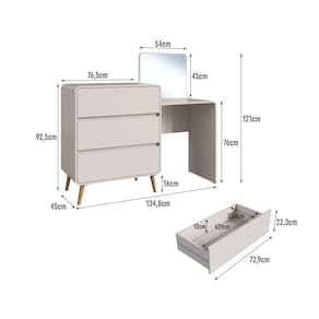 Marca: Completa Móveis | Modelo: Cômoda com Penteadeira e 3 Gavetas | Material: MDP | Acabamento: Fosco | Peso do Produto (Kg): 44,4 | Quantidade de Volume: 1 | Peso Suportado (Kg): 27 | Quantidade de Gavetas: 3 | Tipo da Corrediça: Telescópica | Peso Suportado por Gaveta (Kg): 4 | Possui Chave: Não | Possui Puxador: Não | Quantidade de Pés: 4 | Material dos Pés: Plástico | Necessita Montagem: Sim | Nível de Dificuldade da Montagem: Médio | Sistema de Montagem: Sistema de montagem via parafusos, cavilhas, pregos, sistema minifix | País de Origem: Brasil | Duração da Garantia: 6 meses | Tipo de Garantia: Garantia do Fabricante | Dimensão (A x L x C) cm: 121x45x134,8 | Quantidade de Item: 1 | Tipo de Móvel: Cômoda | Principal Característica do Produto 01: Cômoda Penteadeira Multifuncional | Principal Característica do Produto 02: Penteadeira com Espelho e 3 Gavetas Grande | Principal Característica do Produto 03: Design retrô com acabamento moderno e cantos arredondados | Baterias Necessárias: Não | Frágil: Não | Certificação de Teste Externo: Não Possui | Componentes Incluídos: Manual de Montagem | Número da Peça: CV005 | Inclui Manual de Montagem: Sim | Palavras-chave de Pesquisa: Cômoda infantil, penteadeira com espelho, penteadeira com gavetas | Possui Espelho: Sim | Profundidade (cm): 45 | Largura (cm): 134,8 | Altura (cm): 121 | Cor: Bege Dunas