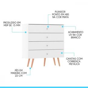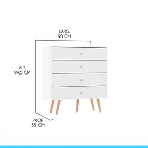 Cômoda Pequena Para Quarto 90cm 4 Gavetas Mdp Menu Móveis Branco Voce ja parou pra pensar em como uma comoda pode transformar o seu ambiente? Ela e o movel perfeito para dar um toque retro e moderno ao mesmo tempo, alem de ser super versatil e combinar com todos os estilos de decoracao. Nao importa se voce e do tipo minimalista ou do tipo acumulador, a comoda tem espaco de sobra para guardar tudo o que voce precisa e manter tudo organizado. E nao e so isso, ela ainda e produzida com materiais de excelente qualidade, garantindo que dure muitos anos. Entao, nao perca mais tempo e de um upgrade na sua decoracao com uma comoda retro e funcional. Seu espaco vai ficar mais aconchegante e bonito, voce merece! O melhor em moveis no design atual aliando qualidade e otimos precos! Caracteristicas: Produzida em MDP de 12 e 15 mm Acabamento UV Gaveta com Corredicas Metalicas Puxadores Ponto em ABS Pes Retro em Madeira com 22 cm