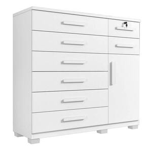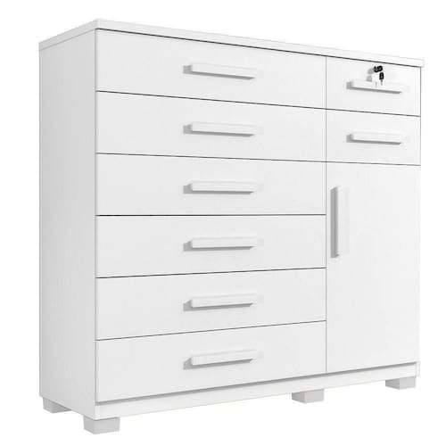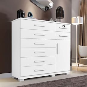 Cômoda Pernambuco 8 Gavetas 1 Porta Com Sapateira - Benetil Branco A Comoda Pernambuco complementa seu quarto com charme e sofisticacao, combinando praticidade e beleza. Com oito gavetas espacosas, sendo uma com chave para maior seguranca, oferece organizacao e seguranca para seus itens pessoais. Suas corredicas telescopicas proporcionam suavidade e resistencia no uso diario. Conta ainda com uma porta e prateleira interna, formando uma sapateira bem estruturada. Fabricada em chapa de 15 mm, garante durabilidade e robustez superiores. Com a tecnologia MDP Perfect, alia sustentabilidade e inovacao, proporcionando longa vida util e facil manutencao. A pintura UV de alta resistencia e facil de limpar e ecologicamente correta, feita com madeira de reflorestamento para uma escolha mais sustentavel. Caracteristicas: Material Principal: Mdp Espessura Da Chapa: 15 Mm Escala De Brilho: Semi Brilho Acabamento: Pintura UV Sistema De Montagem: Parafuso, Cavilha E Cantoneiras Metalicas Quantidade de Gavetas: 08 Quantidade de Portas: 01