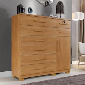 Cômoda Pernambuco 8 Gavetas 1 Porta Com Sapateira - Benetil Cinamomo A Comoda Pernambuco complementa seu quarto com charme e sofisticacao, combinando praticidade e beleza. Com oito gavetas espacosas, sendo uma com chave para maior seguranca, oferece organizacao e seguranca para seus itens pessoais. Suas corredicas telescopicas proporcionam suavidade e resistencia no uso diario. Conta ainda com uma porta e prateleira interna, formando uma sapateira bem estruturada. Fabricada em chapa de 15 mm, garante durabilidade e robustez superiores. Com a tecnologia MDP Perfect, alia sustentabilidade e inovacao, proporcionando longa vida util e facil manutencao. A pintura UV de alta resistencia e facil de limpar e ecologicamente correta, feita com madeira de reflorestamento para uma escolha mais sustentavel. Caracteristicas: Material Principal: Mdp Espessura Da Chapa: 15 Mm Escala De Brilho: Semi Brilho Acabamento: Pintura UV Sistema De Montagem: Parafuso, Cavilha E Cantoneiras Metalicas Quantidade de Gavetas: 08 Quantidade de Portas: 01