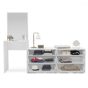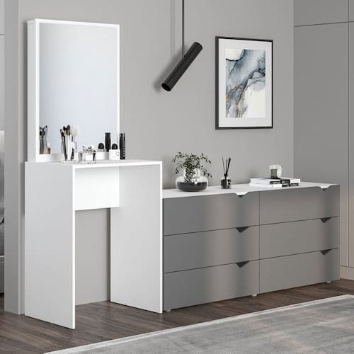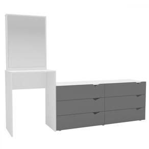 O(a) Cômoda Porto 6 Gavetas com Espelho Cinza/Branco - Politorno é produzido em MDP na escala de brilho Semi-Fosco, e possui um grau de dificuldade de montagem: Fácil.