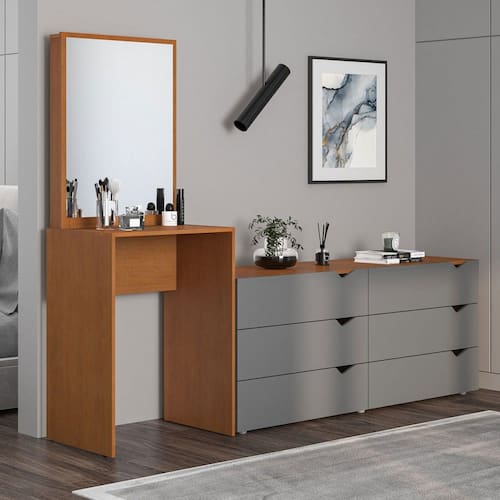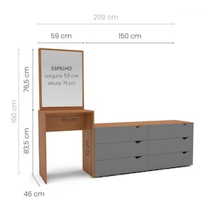 O(a) Cômoda Porto 6 Gavetas com Espelho Cinza/Freijó - Politorno é produzido em MDP na escala de brilho Semi-Fosco, e possui um grau de dificuldade de montagem: Fácil.