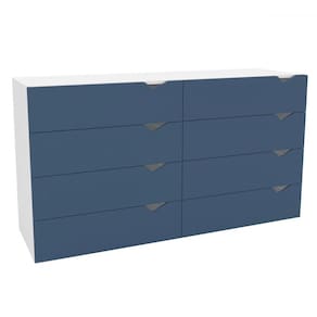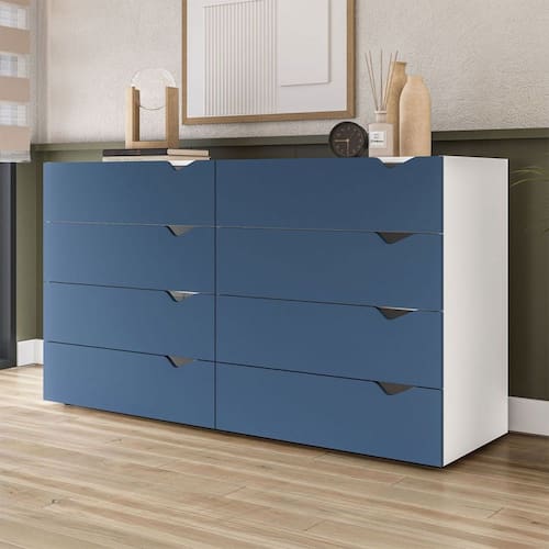 O(a) Cômoda Porto 8 Gavetas Branco/Azul - Politorno é produzido em MDF e MDP na escala de brilho Semi-Fosco, e possui um grau de dificuldade de montagem: Médio.