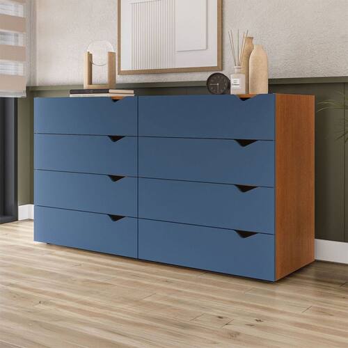 O(a) Cômoda Porto 8 Gavetas Freijó/Azul - Politorno é produzido em MDF e MDP na escala de brilho Semi-Fosco, e possui um grau de dificuldade de montagem: Médio.