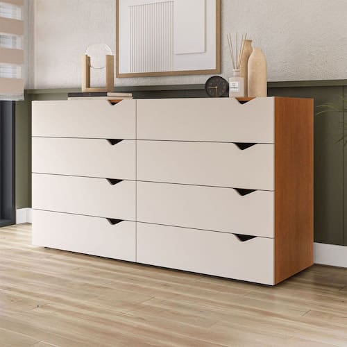 O(a) Cômoda Porto 8 Gavetas Freijó/Creme - Politorno é produzido em MDF e MDP na escala de brilho Semi-Fosco, e possui um grau de dificuldade de montagem: Médio.