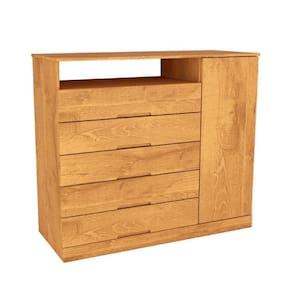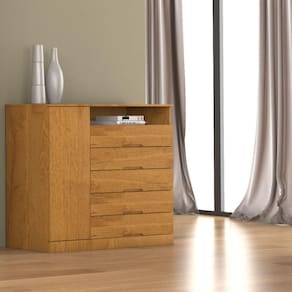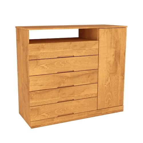 Seu acabamento em verniz UV semi-brilho confere um toque refinado, enquanto os puxadores em madeira acrescentam charme rustico ao design moderno. Com 5 gavetas espacosas, 1 porta lateral com 3 prateleiras internas, e corredicas telescopicas, esta comoda oferece amplo espaco e facil organizacao dos seus itens pessoais.