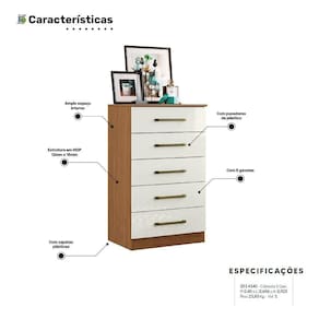 - Praticidade nas gavetas: As 05 gavetas com amplo espaço garantem uma organização eficiente, para que você tenha tudo ao seu alcance sem perder tempo procurando.
