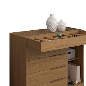 Cômoda Quarto Porta Jóias Com Tampo Vidro 111cm Stefanie Atacama A09 - D'rossi Transforme seu quarto com a Cômoda com Porta Joias Stefanie de 111cm no tom Atacama, uma peça funcional e elegante que alia organização e sofisticação. Com estrutura em MDP de 12 e 15 mm e acabamento em pintura UV com verniz de alto brilho, oferece resistência, durabilidade e um visual refinado. O design neutro e elegante permite fácil combinação com diferentes estilos de decoração. Conta com cinco gavetas espaçosas, sendo a superior com porta-jóias interno, além de uma porta lateral com prateleira interna para objetos maiores. As corrediças telescópicas e dobradiças metálicas garantem suavidade no uso diário. O tampo com vidro incolor adiciona um toque moderno, ideal para expor itens decorativos com charme. Com puxadores de plásticos resistentes e excelente aproveitamento de espaço, é perfeita para ambientes que valorizam beleza e praticidade. A Cômoda Stefanie une tudo o que você precisa em um único móvel. Dimensões do Produto: Altura: 98 cm Largura: 111 cm Profundidade: 47 cm Peso: 52 kg Especificações do Produto: Material da Estrutura: MDP 12 e 15mm Pintura: Pintura UV Acabamento: Verniz Escala de Brilho: Brilho Peso Suportado: 45 kg distribuídos Possui Gavetas: Sim Quantidade de Gavetas: 5 Gavetas sendo a 1 com porta-joias Tipo de Corrediça: Metálica Telescópica Possui Portas: Sim Quantidade de Portas: 1 Porta Tipo de Porta: Convencional Material das Dobradiças: Metálica Possui Puxadores: Sim Material dos Puxadores: 5 Puxadores em PVC resistente Possui Prateleiras: Sim Quantidade de Prateleiras: 1 Prateleira Mostrador com Tampo de Vidro: Sim Possui Nichos: Não Possui Sapateira: Não Possui Espelho: Não Possui Cabideiro: Não Possui chave em Gavetas ou Portas: Não Possui Pés: Não Diferenciais: Design clássico; Amplo espaço interno Sistema de Montagem: Cavilhas e Parafusos. Manual de Montagem: Sim Complexidade da Montagem: Média Montagem: Recomendamos que seja feita por um profissional. Garantia: 90 dias contra defeito de fabricação Instruções de Limpeza: Utilizar um pano limpo e levemente úmido Quantidade de Volumes 2 Caixas Medida das Embalagens Caixa 1: 114x 57x15cm; Caixa 2: 115x 47,5x4,5cm Entrega: É feita somente até o térreo ou portaria. Confira sempre as medidas das embalagens para assegurar que o produto passe por portas e escadas do local.