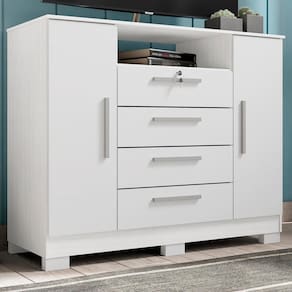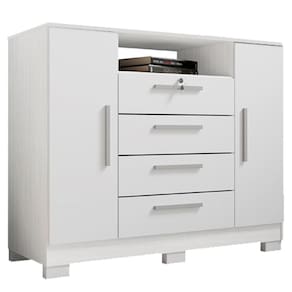 Apresentamos a Cômoda Rack com 2 Porta e 4 Gavetas Madri, uma móvel elegante e funcional para complementar seu ambiente com estilo e organização. Possui 1 fechadura com chave apenas na primeira gaveta. Estrutura em MDP de 12mm. Gavetas espaçosas equipadas com corrediças telescópicas, garantindo um deslizamento suave e silencioso, suas 2 portas equipadas com dobradiças metálicas. Puxadores em ABS, enquanto os pés de plástico proporcionam estabilidade e resistência. Além disso, a pintura UV texturizada oferece um acabamento impecável, realçando a durabilidade e beleza do móvel. Ideal para quem busca praticidade sem abrir mão do design. Este móvel chegará na sua casa separado em 01 volume.