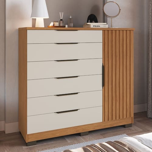 A Cômoda Ripada 6 Gavetas 1 Porta com Pés Vegas Faimec combina elegância e funcionalidade. Conta com 6 gavetas espaçosas e 1 porta para melhor organização. Com acabamento acetinado texturizado, sua estrutura em MDP garante durabilidade, enquanto as corrediças telescópicas proporcionam um deslizamento suave. Os puxadores em ABS e os pés agregam charme e estabilidade ao móvel, tornando-o uma excelente escolha para seu ambiente.
