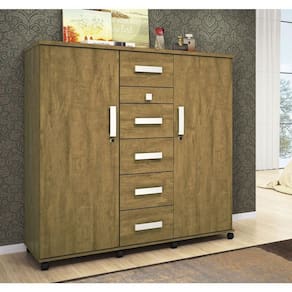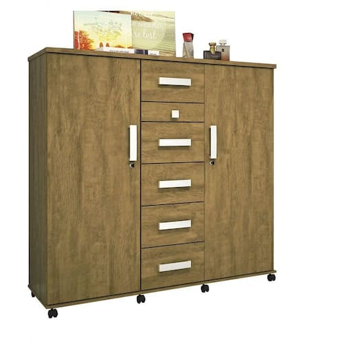 A Cômoda Roma - Lukaliam Móveis é fabricada com materiais de excelente qualidade e design audacioso de linhas retas com proporções compactas como seus diferenciais. Possui duas portas laterais com chave, cabideiro em alumínio, gaveta espelheira, cinco gavetas centrais, porta objetos, porta cinto, rodízios para facilitar a movimentação da cômoda e ainda você pode colocar sua tv na parte superior, é um móvel pensado para otimizar espaços, já que ela se encaixa tanto em cenários tradicionais como jovens e despojados. Leve esta linda e versátil cômoda para seu lar!