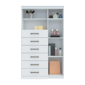 Além de possuir 06 amplas gavetas com corrediças metálicas com seus puxadores em ABS, possui 2 Prateleiras, 1 Porta com Prateleiras e 1 Espelho.