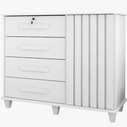 Estrutura: MDF/ MDP tampo e base em MDF 18 mmAcabamento: Pintura U.V.,Gaveta: Sim, 04 gavetas e com corrediças telescópicas e sendo 1 gaveta com chave que suportam o peso de 5 kilos cadaPorta: Sim, 01 porta com dobradiças metálicasPrateleiras: Sim, 02 prateleiras que suportam o peso de 5 kilos cada, para melhor aproveitamento do espaçoPuxador: Sim, em MDFPés: Sim, 06 pés em PVC, maior durabilidade e segurança sem agredir o pisoDimensões do produto montado