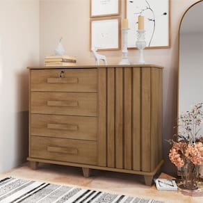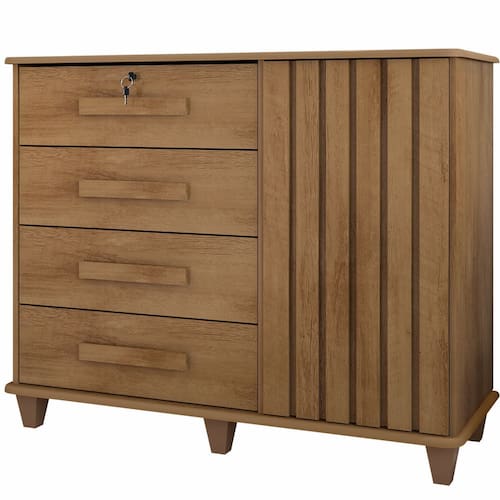 Descrição: A Cômoda Grécia ripada é essencial para quem quer um design moderno no ambiente, sem deixar a praticidade do dia a dia de lado! Ela conta com 4 gavetas espaçosas para manter melhor a organização, sendo uma com tranca e chave, duas prateleiras internas que auxiliam na hora de guardar seus sapatos e outros pertences. Além de possuir a opção de detalhe ripado na hora da montagem e pés resistentes que não agridem o chão e facilitam na hora da limpeza.