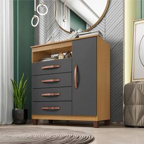 Esta cômoda é ecologicamente correta e de montagem simples, tornando-a uma escolha prática e consciente. Os quatro pés de plástico na cor tabaco garantem estabilidade, e as gavetas deslizam suavemente graças às corrediças metálicas. Os puxadores cromados adicionam um toque de elegância ao design.