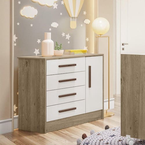 A Cômoda Sapateira com 1 Porta e 4 Gavetas Q Encanto Qmovi, é perfeita para quem procura um móvel charmoso e funcional para o quarto do filho. O móvel possui quatro gavetas com excelente profundidade e uma repartição que serve como sapateira, proporcionando ainda mais organização para itens de vestuário e demais objetos. Seu sistema anti-tombamento, garante segurança para evitar riscos de acidentes.