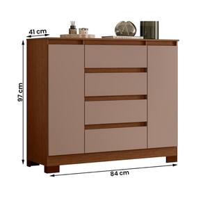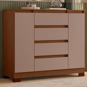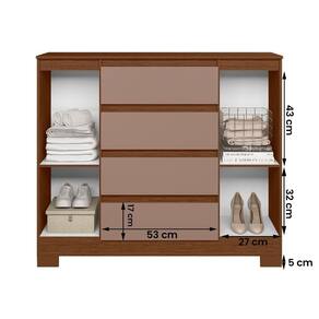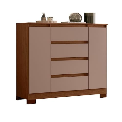 Com 4 gavetas de corrediças telescópicas e 2 portas amplas, oferece espaço funcional para roupas e sapatos.