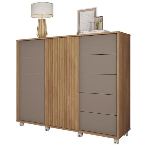 Ela possui amplo espaço interno, 5 gavetas com corrediças telescópicas que deslizam suavemente, 1 porta de correr com detalhe ripado que confere um charme especial e 1 porta convencional. Além disso a Cômoda conta com prateleiras internas para sapatos, bolsas o que mais quiser e um cabideiro de alumínio. Ah! E também pode ser usada como Rack Para de até 65'', sendo ideal para quartos e salas. Produzida em MDP/MDF 15MM, com acabamento em pintura UV que garante maior durabilidade e resistência. Ela também conta com rodízios que facilitam a movimentação. A Cômoda Sapateira é a peça que faltava para deixar o seu ambiente mais bonito e organizado.