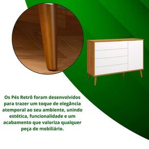 Os puxadores usinados garantem um visual contínuo e elegante, enquanto os pés em madeira elevam o móvel do chão, facilitando a limpeza e acrescentando charme ao design.