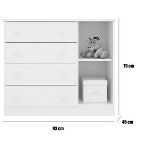 A cômoda sapateira infantil proporciona um ótimo espaço de organização de roupas, lenços, fraldas, itens de higiene e até mesmo aproveitá-la para dispor o trocador sob o tampo e, assim, facilitar o acesso dos objetos. A cômoda sapateira infantil é em MDP de 12/15mm com sistema de pintura UV. Ela conta com 1 porta com dobradiças metálicas, 4 gavetas com corrediças metálicas, puxadores duplos em plástico poliestireno com formato de estrela, que deixará seu ambiente mágico, bordas do tampo com um ótimo acabamento em perfil PVC e sistema anti-tombamento para evitar riscos de acidentes. Sua limpeza é tranquila, limpar com flanela ou pano macio seco, não utilizar produtos abrasivos, desengordurantes, álcool ou solvente. Não expor o produto diretamente á luz solar e á umidade.