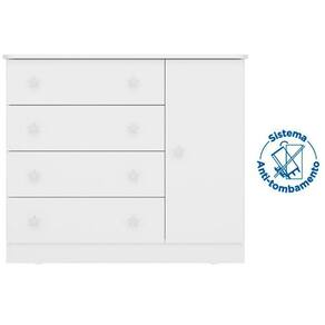 - Informações Adicionais: Sistema anti-tombamento para evitar riscos de acidentes, Puxadores duplos em plástico poliestireno com formato de estrela, Gavetas com corrediças metálicas, Porta com dobradiças metálicas
