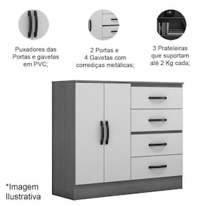 - Estrutura em MDP; - Pintura UV velluto; - Puxadores em PVC; - 4 Gavetas com corrediças metálicas; - 2 Portas de bater; - 3 Prateleiras internas; - Não acompanha objetos decorativos;